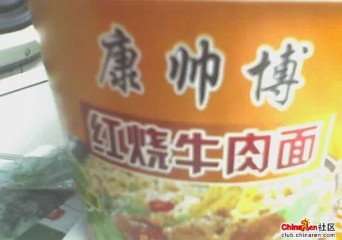在超市買了一碗康師傅速食麵,吃著吃著不對勁呀,仔細一看,原來是康帥博速食麵