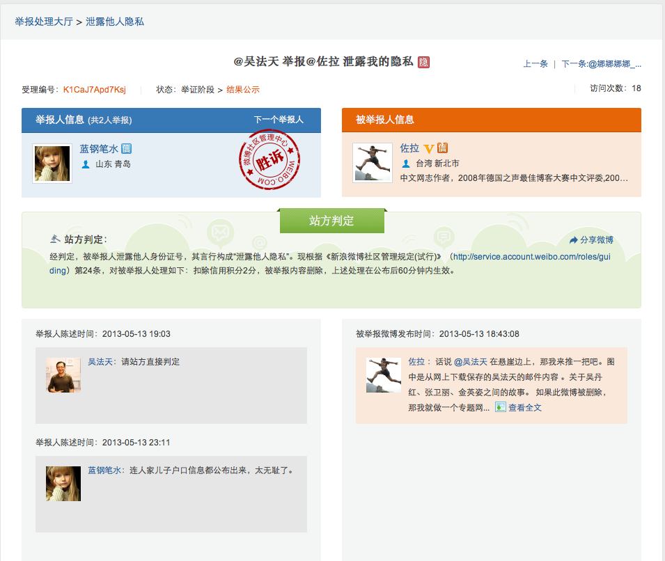 原来我是被 @吴法天 和 @蓝钢笔水 两个人举报了,吴法天认为我贴出他的身份证号码构成“泄露他人隐私”,而 @蓝钢笔水 认为我贴出来了 吴一昊 的户口信息“无耻”。