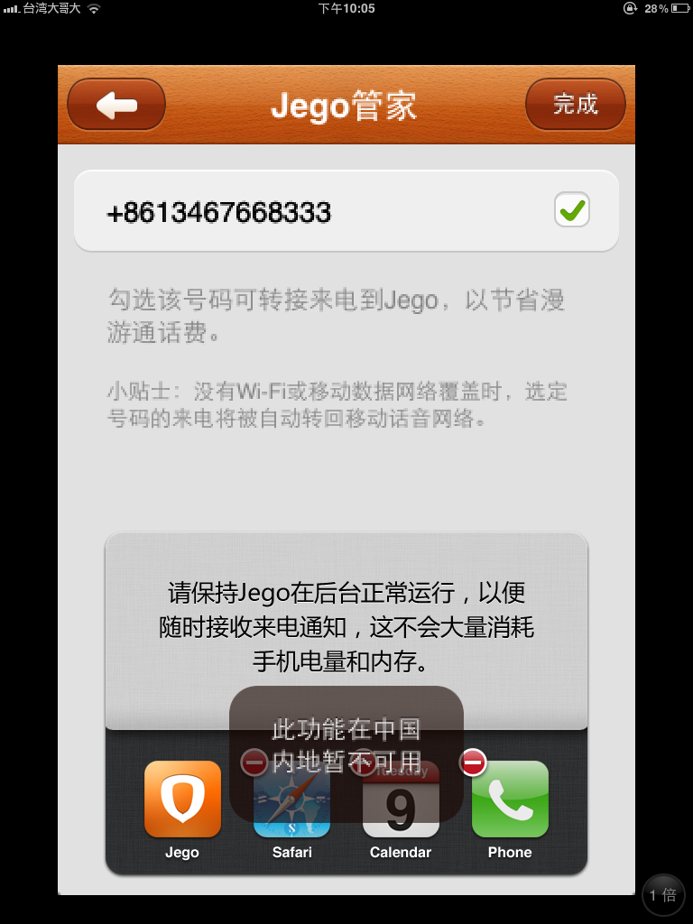 Zola问:非常高兴能使用到你们这么方便的服务,但是中国app store不能下载Jego,似乎国内政策有限制。不知道短信是不是也能转发到Jego上来,目前看到联通类似的 wo-call.com 是能在海外接电话也能收发短信的,希望贵公司继续努力改善:)