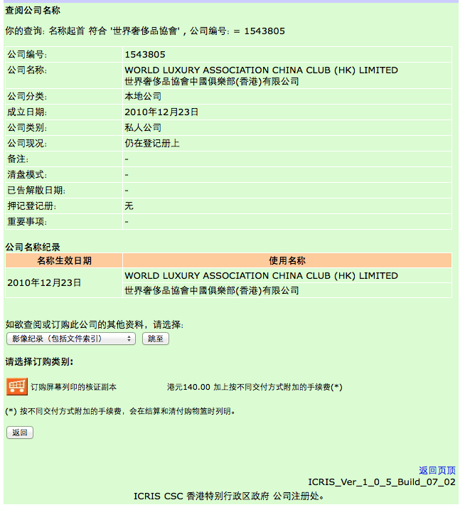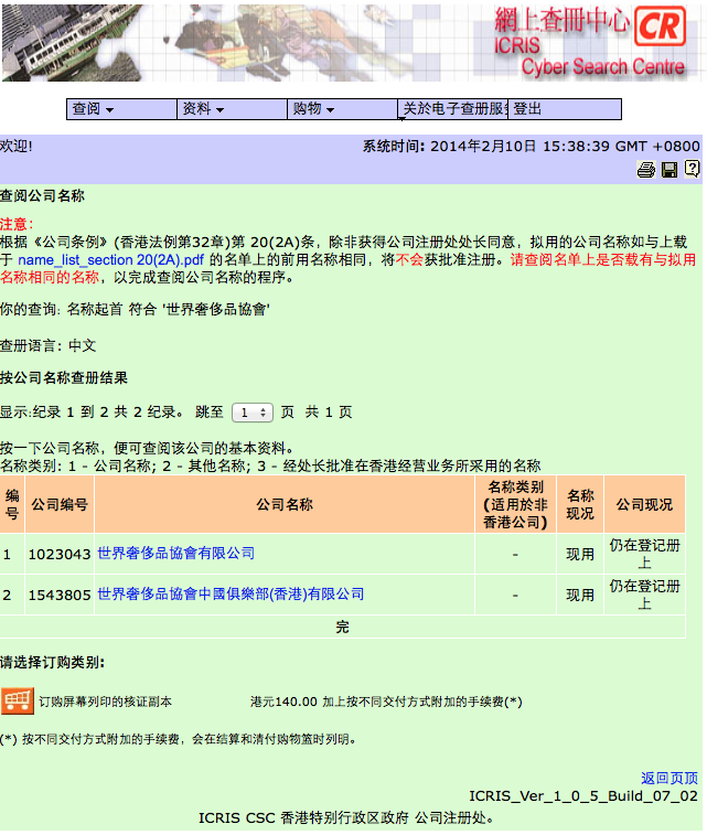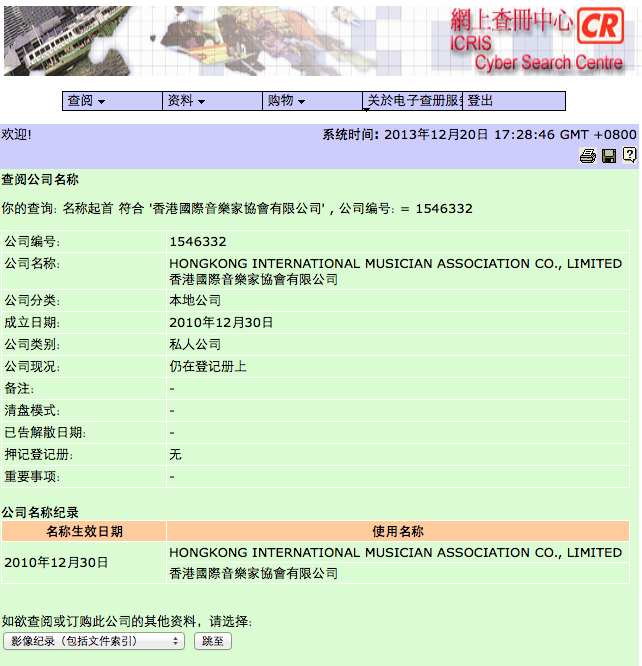 世界奢侈品協會有限公司和香港国际音乐家协会有限公司都是在香港注册的,先把他们的公司名字转换成繁体,然后去 香港公司注册处的查册中心查询,