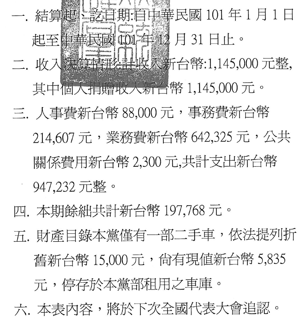 根据中华民国内政部网站上的 101年政黨財務申報资料显示 http://www.moi.gov.tw/dca/001/101/A113.pdf ,中华统一促进党是234个政党中的第113个登记备案的政党,资产由个人捐助,去年只有114万5千元台币,党产只有一台二手车,并且此财务申报“尚未經黨員(代表)大會通過”。