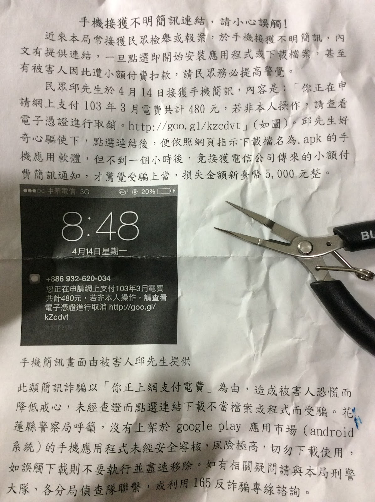 在Twitter看到 @htchien 收到诈骗短信: https://twitter.com/htchien/status/474770475181035521