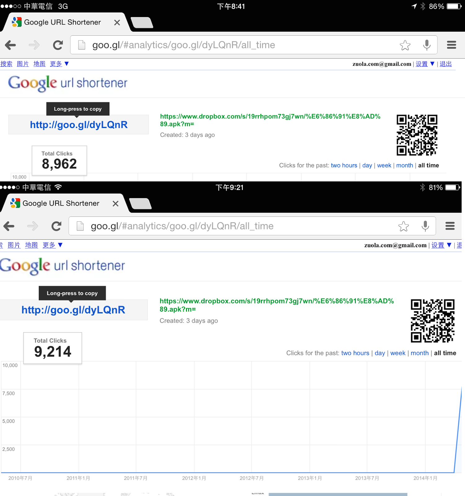 我 输入 http://goo.gl/kZcdvt.info ,查到 又是 %E6%86%91%E8%AD%89.apk,又是 憑證.apk ,这个链接自2014年4月13号被传播29149次,地理信息显示在台湾被打开28549次,台湾的Android手机占有率很高,如果有80%的Android手机,20%人打开, 50%的人安装成功,每个人损失5000台币,28549*0.8*0.2*0.5*5000=11419600台币,约1千1百万台币的钱被偷走,要是台湾警方给力一点,从手机号码登记者入手,从短信扣费服务商的支付试入手,我就不信抓不到这个病毒制造者。