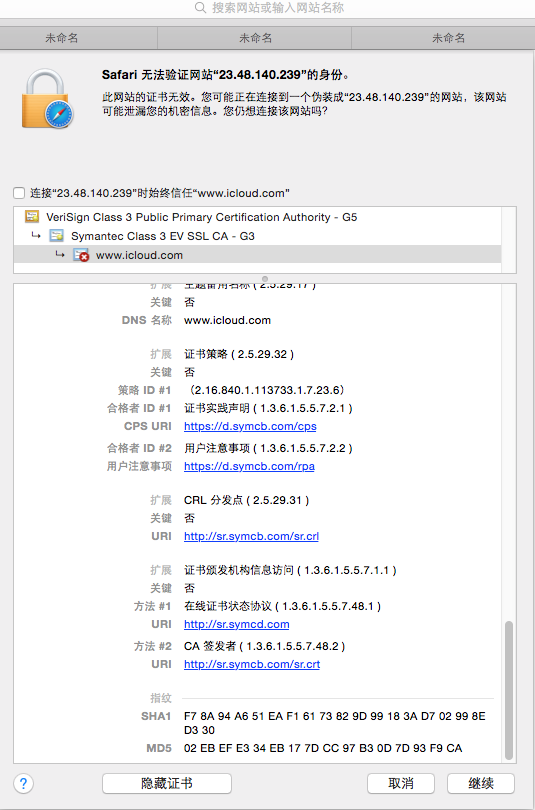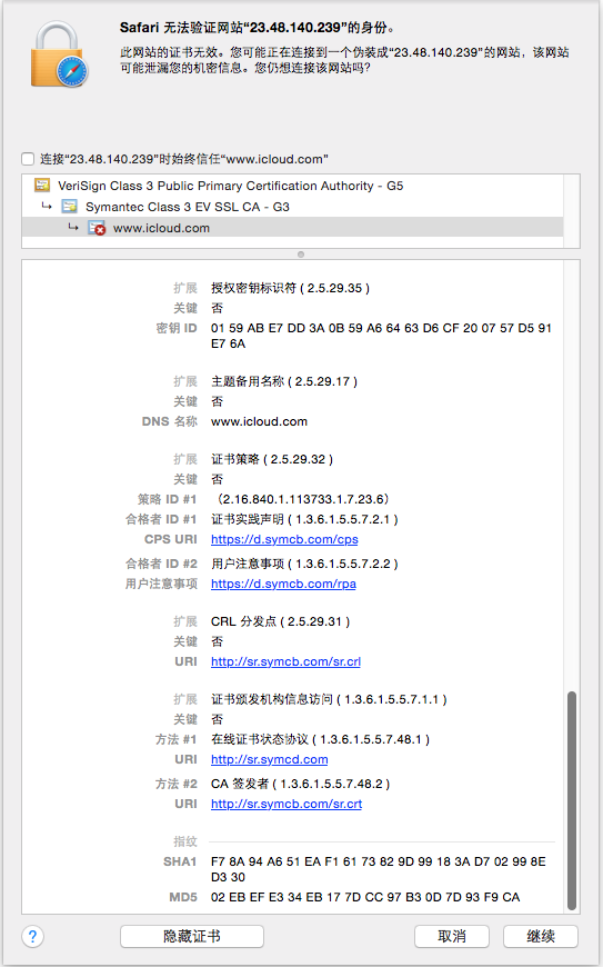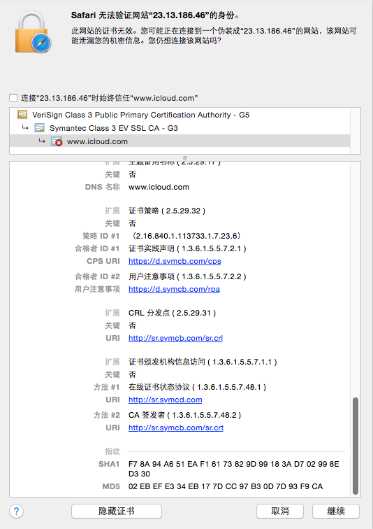 而访问 https://23.48.140.239 这个 iCloud 服务器,无论是在台湾还是在苏州,得到的证书的指纹与真正的icloud.com 的证书的指纹是一致的: