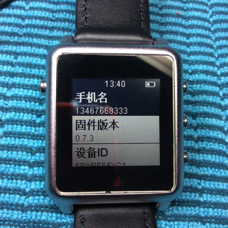 按右边的中间的键就可以进入手表菜单,进设置选项看到手机的名字。开始我惊讶了一下为什么知道我手机的号码,麦步的人告诉我是当初下载并安装麦步手表的手机APP的时候用了短信验证。我想起来是上个月22号众筹前我安装的,当时安装了这个APP我才相信这款手表应该是真实存在的,才决定参加众筹。