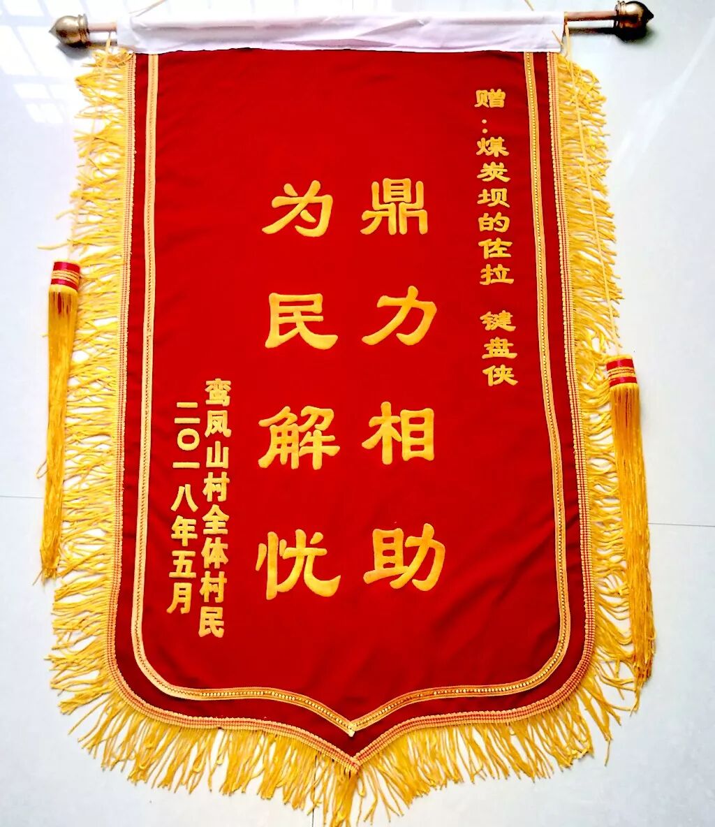 对了,还有谁要请我吃麦当当?估计有很多,我就把这个当创业服务好了,正式提供服务,整理材料500块一次,发布文章到公众号10000块一篇,付不起钱的可以选择另一个方式,写封亲笔信并去淘宝网花30块人民币做一面同时有“键盘侠”和“佐拉”的锦旗寄给我,即可节省一万块人民币。你看我上个月帮助益阳市赫山区鸾凤山反对填埋剧毒锑矿渣到他们这个地质下陷地区,村民给了我一块锦旗: