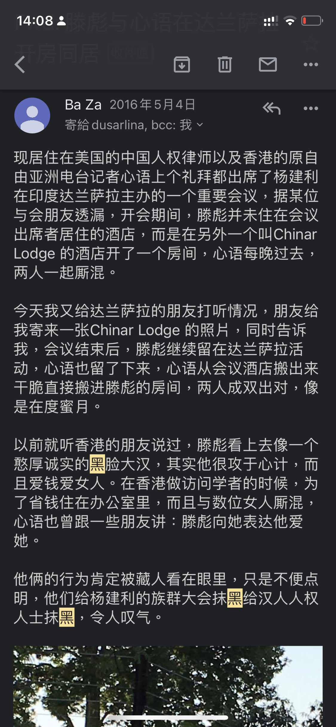 第三,調查發現早在 2016 年5月4日,即出現匿名散布的黑函郵件,指稱兩人在達蘭薩拉某酒店「開房同居」。該黑函於 2019 年事件公開發酵,內容使用定罪式語言,但未提供任何原始證據。這一事實顯示,相關指控並非自然隨時間浮現,而是長期處於匿名流傳與輿論操作的環境之中,心語亦曾親自提供對話截圖推波助瀾,此一背景有必要納入整體可信度評估。