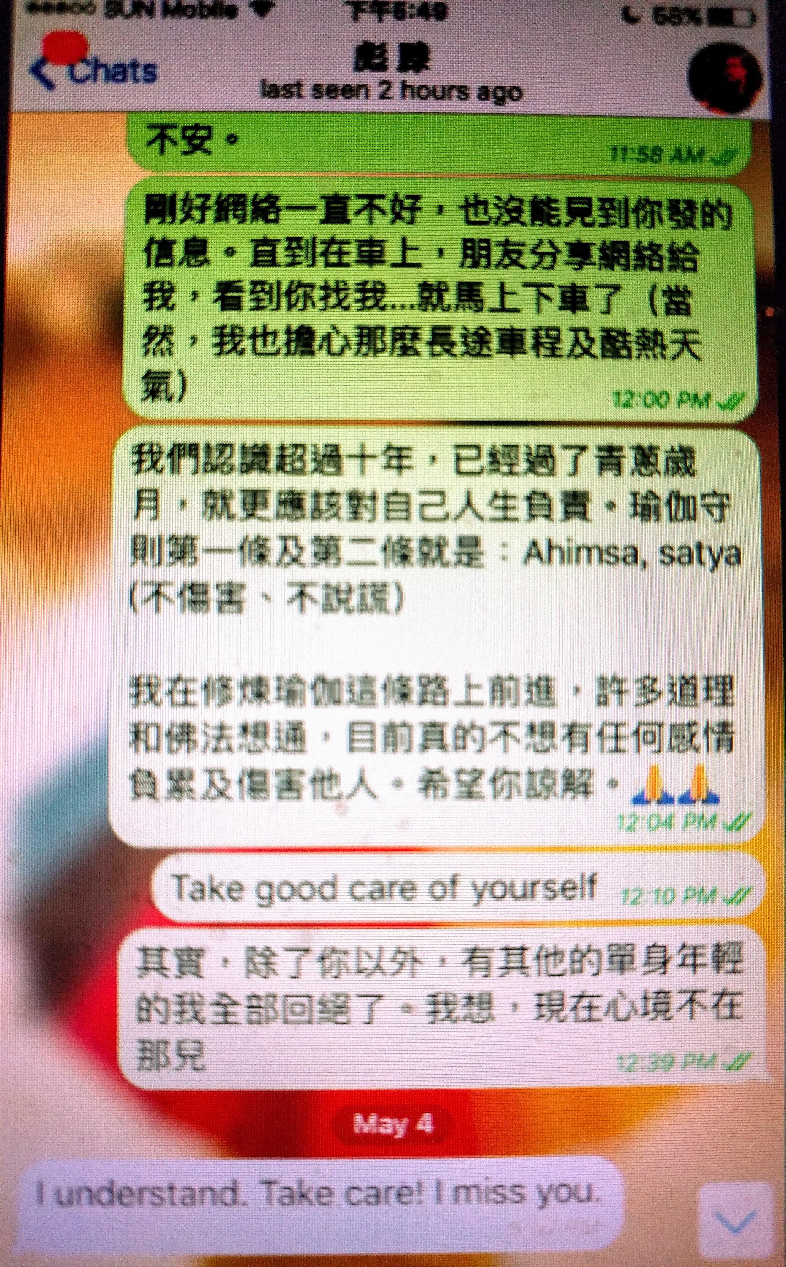 其次,2016 年 5 月初的 通訊工具的對話紀錄,顯示雙方在印度期間存在文字溝通。內容包括情感表達、彼此理解與自我節制的表述,並未出現任何威脅、恐嚇、施壓或利用職位迫使對方服從的語句。這些對話截圖可判斷出由心語本人保存並公開,能印證滕彪於2023年的“一场异常笨拙的求爱”的説法,其內容本身不支持「遭受暴力或恐嚇」的敘事。