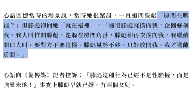 - 滕彪明確表示:「在我記憶中,我沒有撲上去,沒有限制她離開。」
