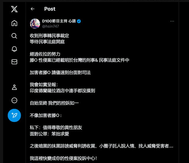 更關鍵的是,心語於 2025 年 7 月 19 日的最新公開發言中,明確表示「在印度德蘭薩拉酒店中,連手都沒摸到」。此一說法,與其 2023 年所描述的多次肢體接觸與強制行為,存在實質且重大的差異。從法律與新聞專業角度而言,關鍵事實在不同時間點出現顯著變動,必然影響整體指控的可信度評估。